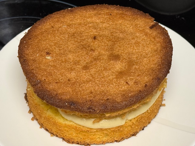 - Une fois la crème est prête, couper la génoise en deux dans le sens de la longueur.