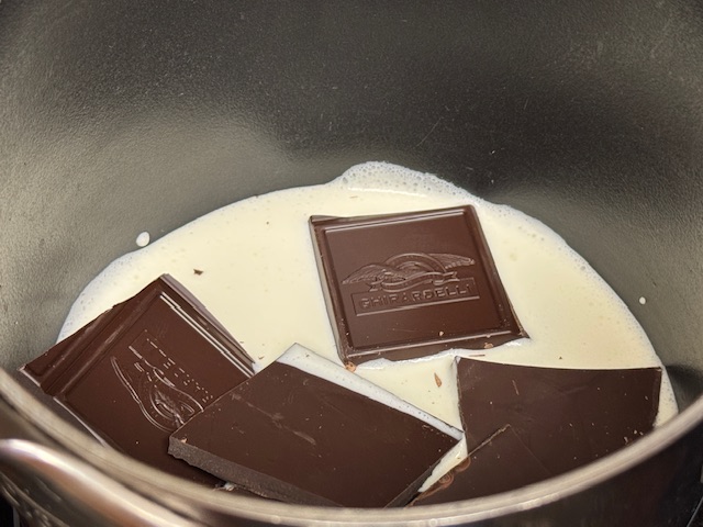- Dans une casserole, mettre la crème et le chocolat. Faire fondre sur un feu doux. Remuer jusqu’à ce que le tout soit homogène.
