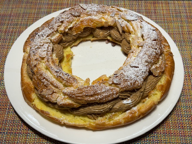 Suite à une soirée de jeux de plateaux de l’OCA vendredi, la recette du Paris-Brest du livre vient d’être révisé. Je préfère le praliné caramélisé à celui de la recette originale, même si (ou parce que, vu où vous êtes) c’est plus de travail. Mais j’ai maintenant une plainte contre la recette de Gaston Lenôtre telle qu’elle se trouve dans la Bible. Son temps de cuisson n’est pas assez long — il conseillé 30 minutes. Il faut le faire 40 minutes pour une si grande pâtisserie, et j’ai le Paris-Brest tombé pour le prouver (pas celui en bas). Ceux qui se souviennent de ce qui veut dire les yaks sur ce blog peuvent se rassurer — ce sera abordé dans mon livre !