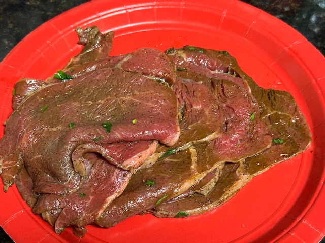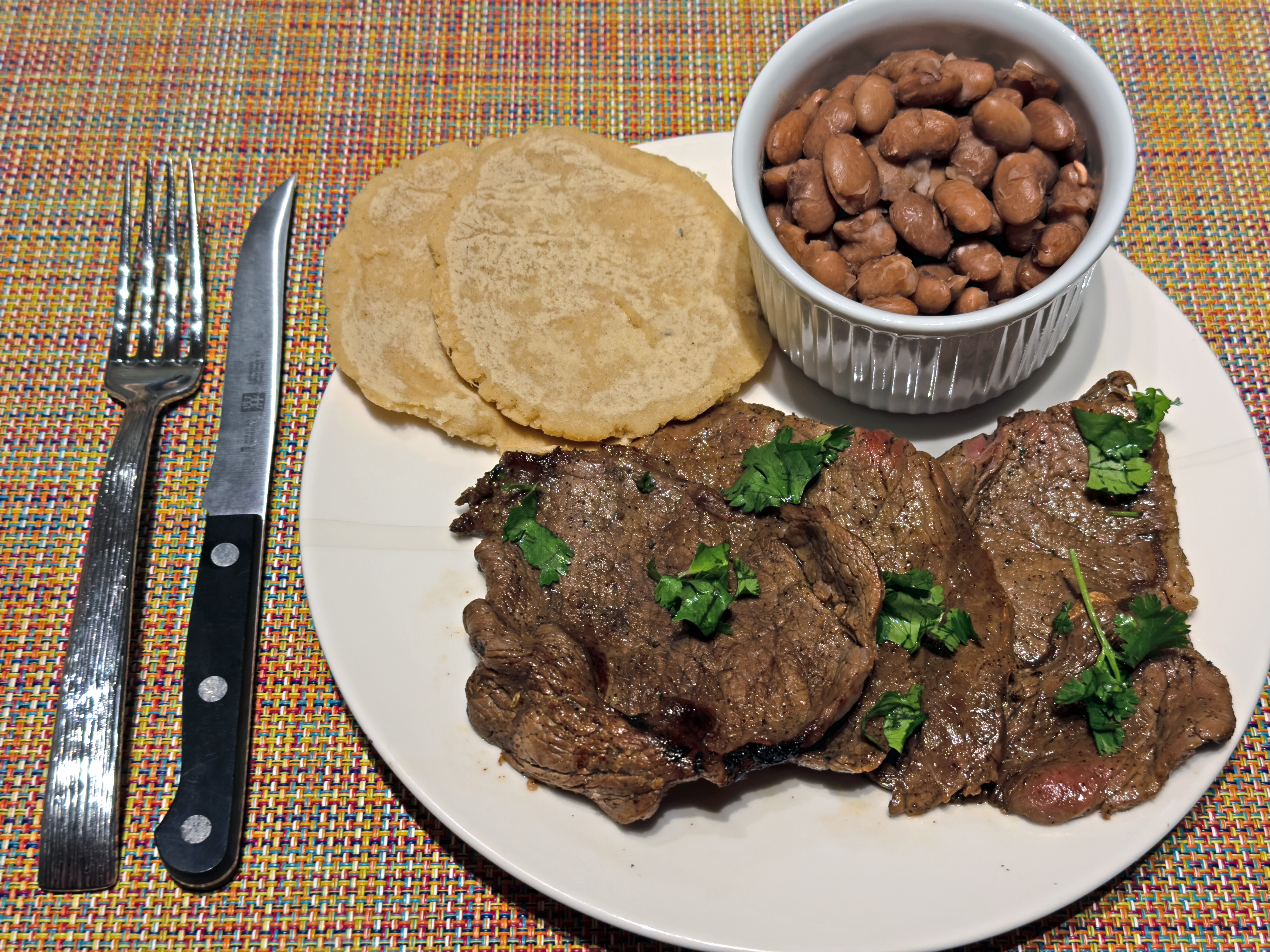 Il n’y a pas de Dimanche avec Marcel cette semaine parce que le 5 mai tombe lundi, ce qui est aussi le jour de la balado. Et chaque année, je vous propose un dîner mexicain pour Cinco de Mayo, ou comme disait M. le président Obama, Cinco de Cuatro. Nos autres plats : tacos de poulet à l’achiote, la birria, le chili colorado. Cette année, je vous présente la carne asada (littéralement « viande grillée ») et les frijoles de la olla (« haricots de la casserole ») :
