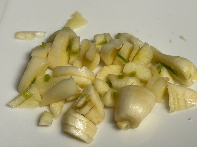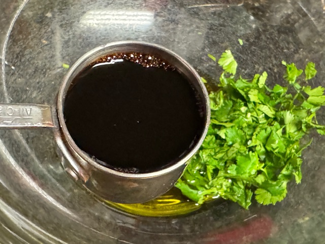 - Laver et émincer les feuilles de coriandre et les gousses d’ail.