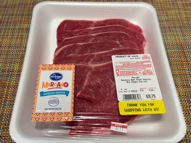 En effet, ça nous amène à une plainte que j’ai partagé avec vous il y a longtemps, mais ne peux plus trouver, que le bœuf en particulier est souvent vendu trop fin chez les bouchers, selon les besoins uniquement des cuisiniers mexicains. Je voulais soit de l’onglet soit de la bavette — le premier n’était pas disponible, et le dernier venait soit en de gros steaks d’un kilo ou plus, soit déjà tranché uniquement pour carne asada. Ne me croyez pas sur parole ; voici le paquet, portant le nom « Mercado », ainsi que celui de Kroger, la société mère de Ralphs :