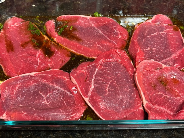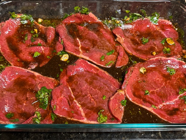 - Verser la marinade dans un plat rectangulaire et y déposer la viande. Faire retourner plusieurs fois pour recouvrir la viande, filmer à contact et laisser reposer 1-2 heures au frigo.