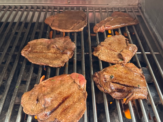 - Préchauffer le grill jusqu’à 230-250° C. Si le steak reste entier, le faire cuire 4-8 minutes le côté selon son épaisseur. Si c’est déjà tranché finement, le faire cuire 1 – 1 1/2 minutes le côté.