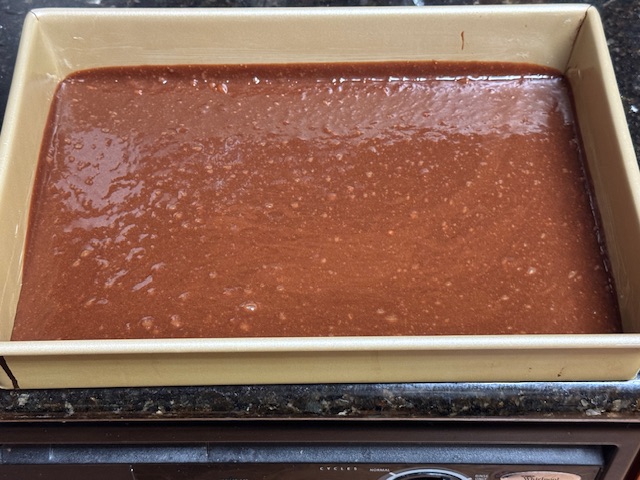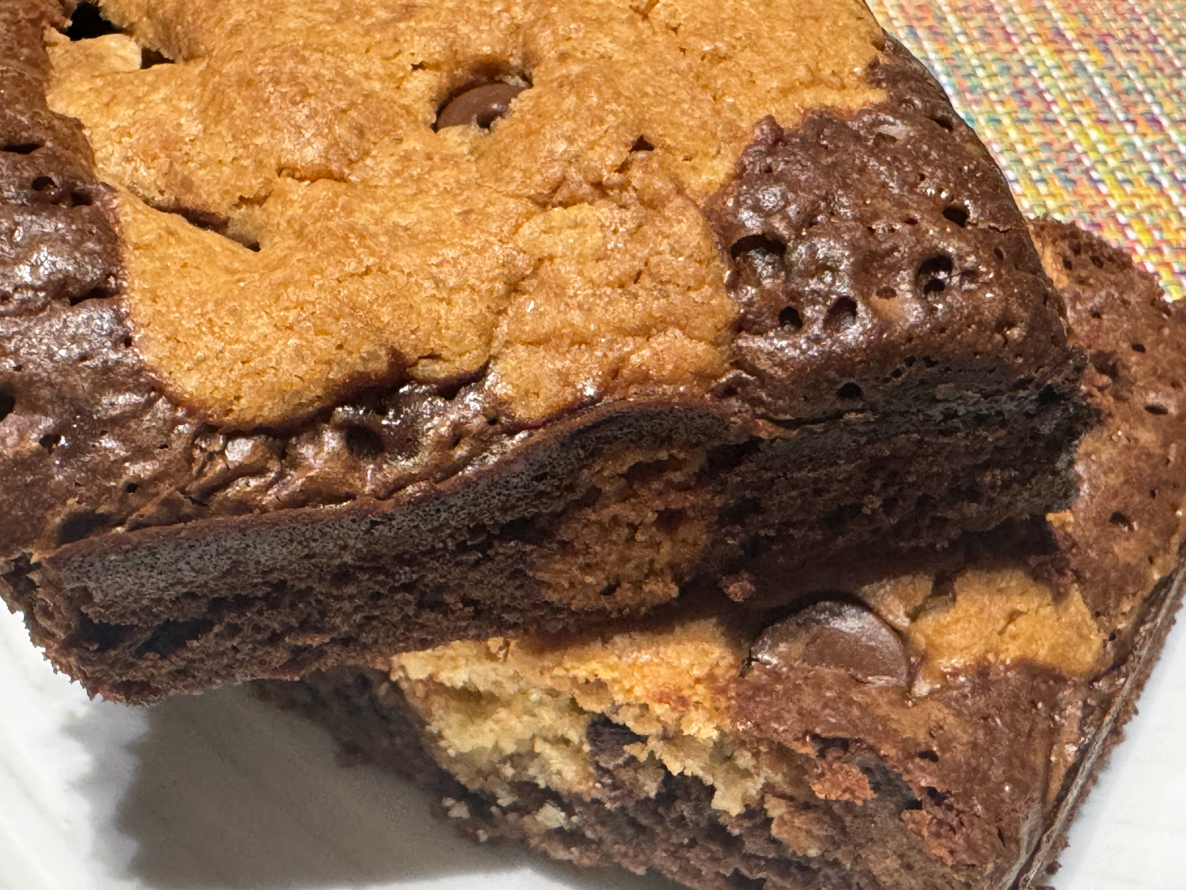 Tout est tiré de la recette originale de Péla. Mais il y a quelques changements. Pour une chose, il n’y a pas de noix de pécans caramélisées, parce que La Fille m’a demandé que la recette soit sans fruits de coque. J’allais donc remplacer ces trucs avec des carrés de chocolat noir comme suggéré Péla dans la recette originale. Peut-être que vous vous souvenez du fait que le chocolat Ghirardelli 60 % est mon préféré pour ce genre de pâtisserie. Quand je suis allé chez Ralphs, le prix avait monté en flèche — de 4,29 $ à 5,79 la barre de 113 grammes ! J’ai donc remplacé le Ghirardelli avec du Lindt — 3 $ la barre — mais nous sommes moins fans de ce dernier alors j’en ai acheté moins. Juste assez pour faire la partie brownie, avec des pépites de Ghirardelli pour les cookies.