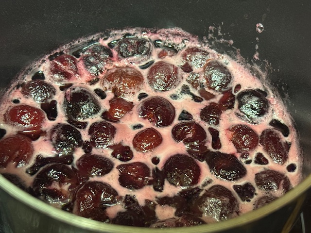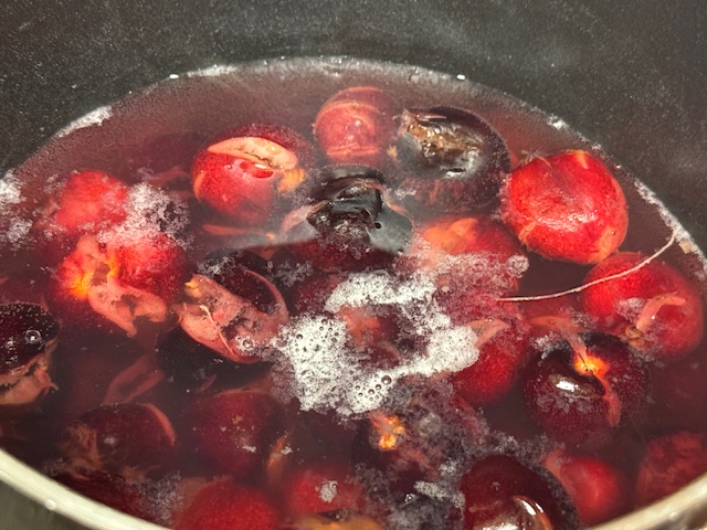 - À la fin du cuisson, tamiser les cerises pour retirer le jus. Garder le jus dans un bol pour faire la gelée. La moitié des cerises iront dans la crème pâtissière.