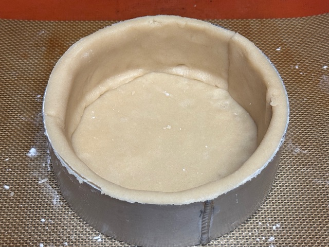 - Étaler la pâte sucrée sur un plan de travail fariné. Foncer la pâte dans un cercle de pâtisserie de 15 cm sur une plaque de cuisson. Je l’ai fait par bandes. Piquer le fond avec une fourchette, puis laisser reposer 15 minutes au frigo.