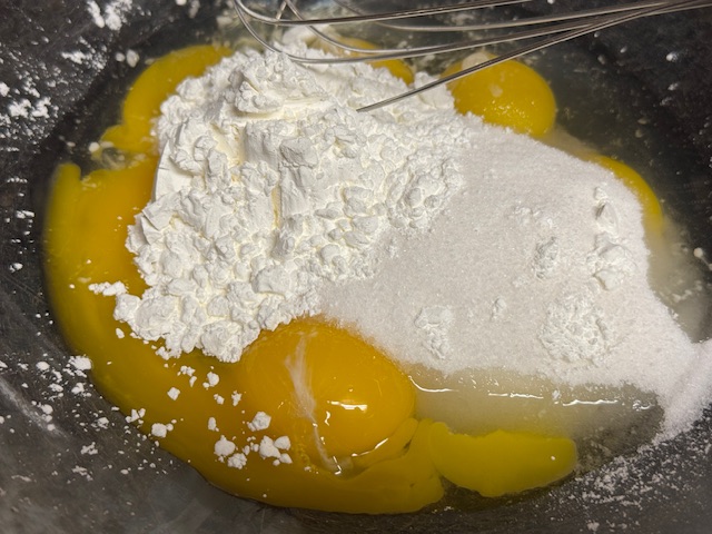 - Dans un saladier, verser les jaunes d’œuf, le sucre et la maïzena. Fouetter bien.