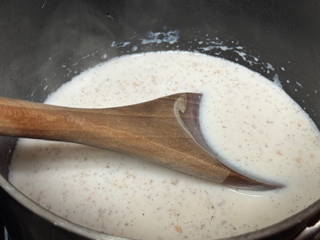 - Verser le lait et la vanille dans une casserole. Sur un feu moyen-vif, faire chauffer jusqu’au point où il y a de la vapeur.