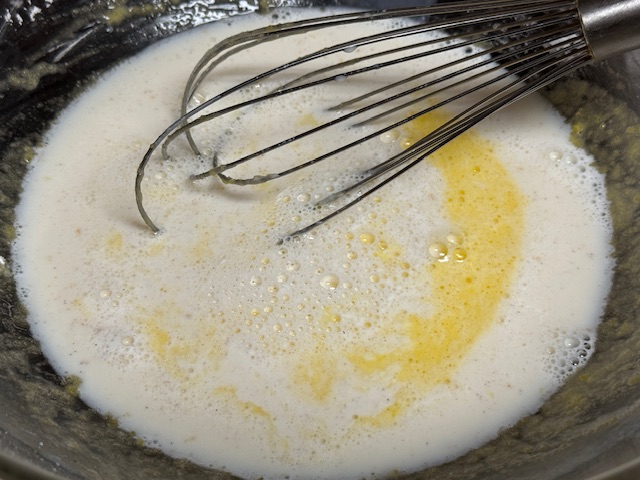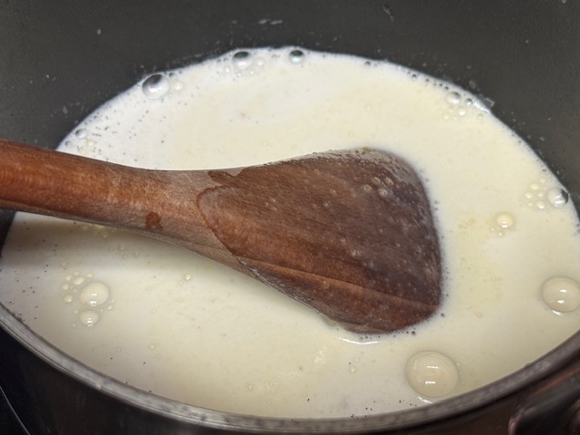 - Quand le lait est chaud, verser 1/3 dans le saladier et fouetter le tout ensemble. Puis verser dans la casserole, baisser le feu jusqu’à moyen, et remuer sans cesse. Après 10-15 minutes, la crème deviendra épaisse. Éteindre le feu et passer un mixeur plongeant dans la casserole pour éliminer les grumeaux.