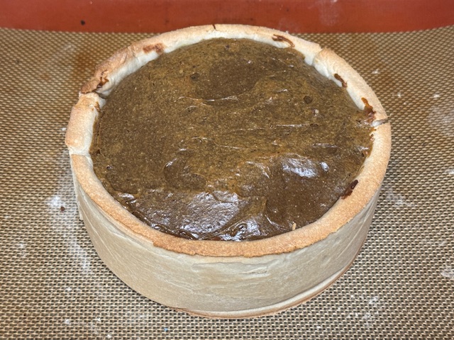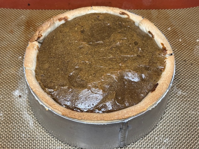À noter, j’ai foncé la pâte dans le cercle par bandes. La croûte s’est cassée exactement où il y avait des soudures. Si vous faites ça, attention à étaler une bande assez longue pour étendre tout autour du cercle.