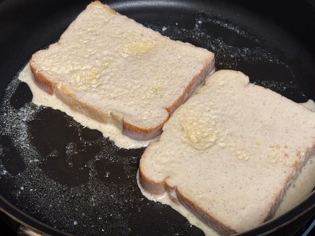 - Tremper 2 tranches de pain dans le mélange, des deux côtés. Mettre le pain dans la poêle, faire cuire 2 1/2 minutes, puis retourner. Faire cuire encore 2 1/2 minutes, puis retirer le pain de la poêle.