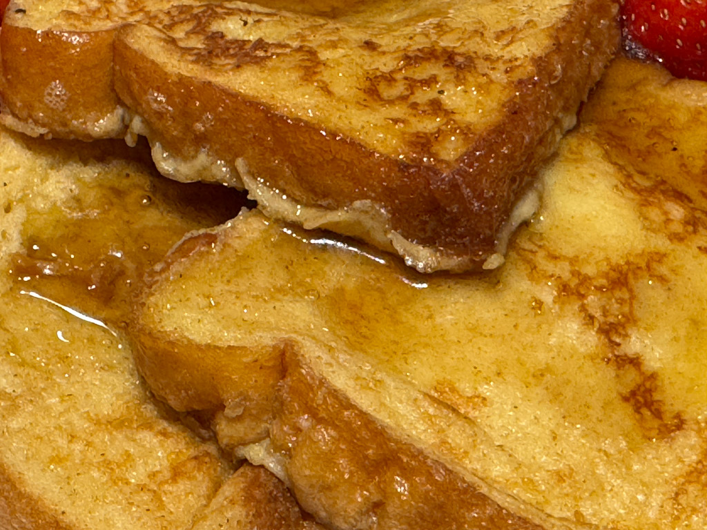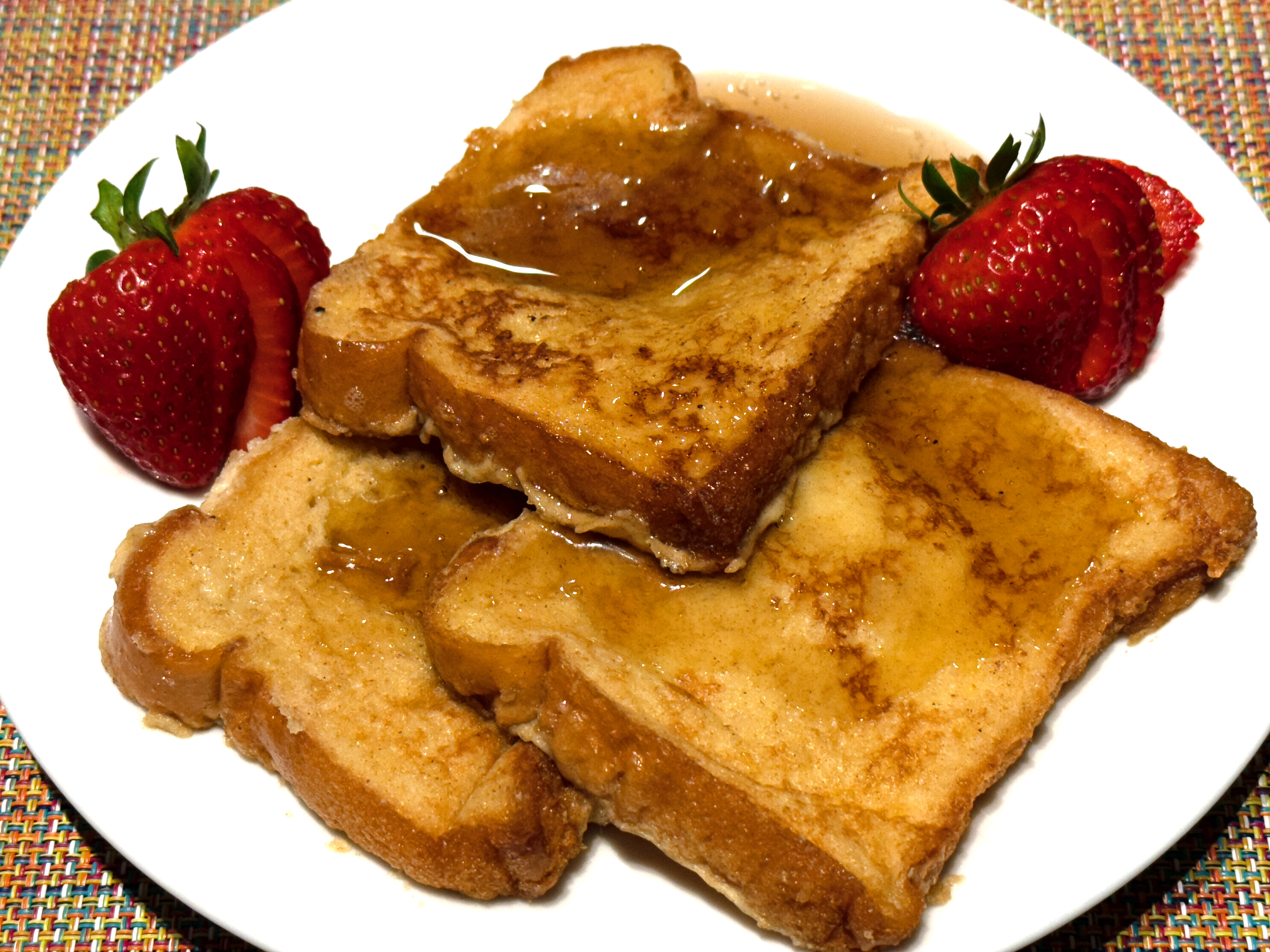 À noter, chez nous le pain perdu est un plat principal pour le dîner, même sucré. Nous ne sommes pas uniques à cet égard — on peut le commander la nuit chez IHOP et chez Denny’s, deux grandes chaînes d’un genre de resto dit « familial » aux États-Unis. (Google me dit que cette expression existe en France, mais aux É-U, il s’agit d’un resto où le petit déjeuner est disponible toute la journée, et souvent 24h/24 et 7j/7. Ai-je écrit ça correctement ?)