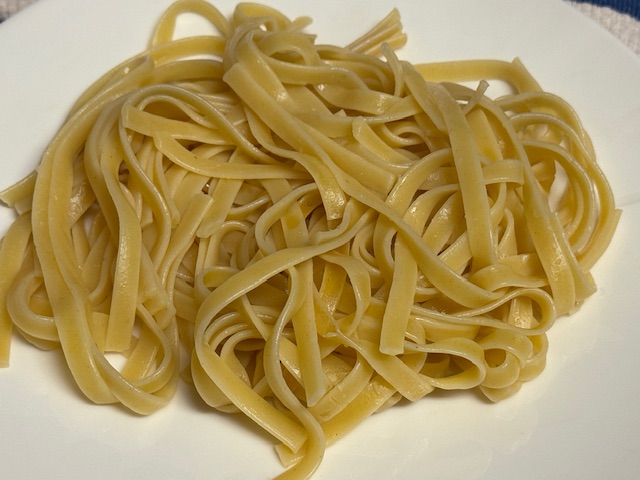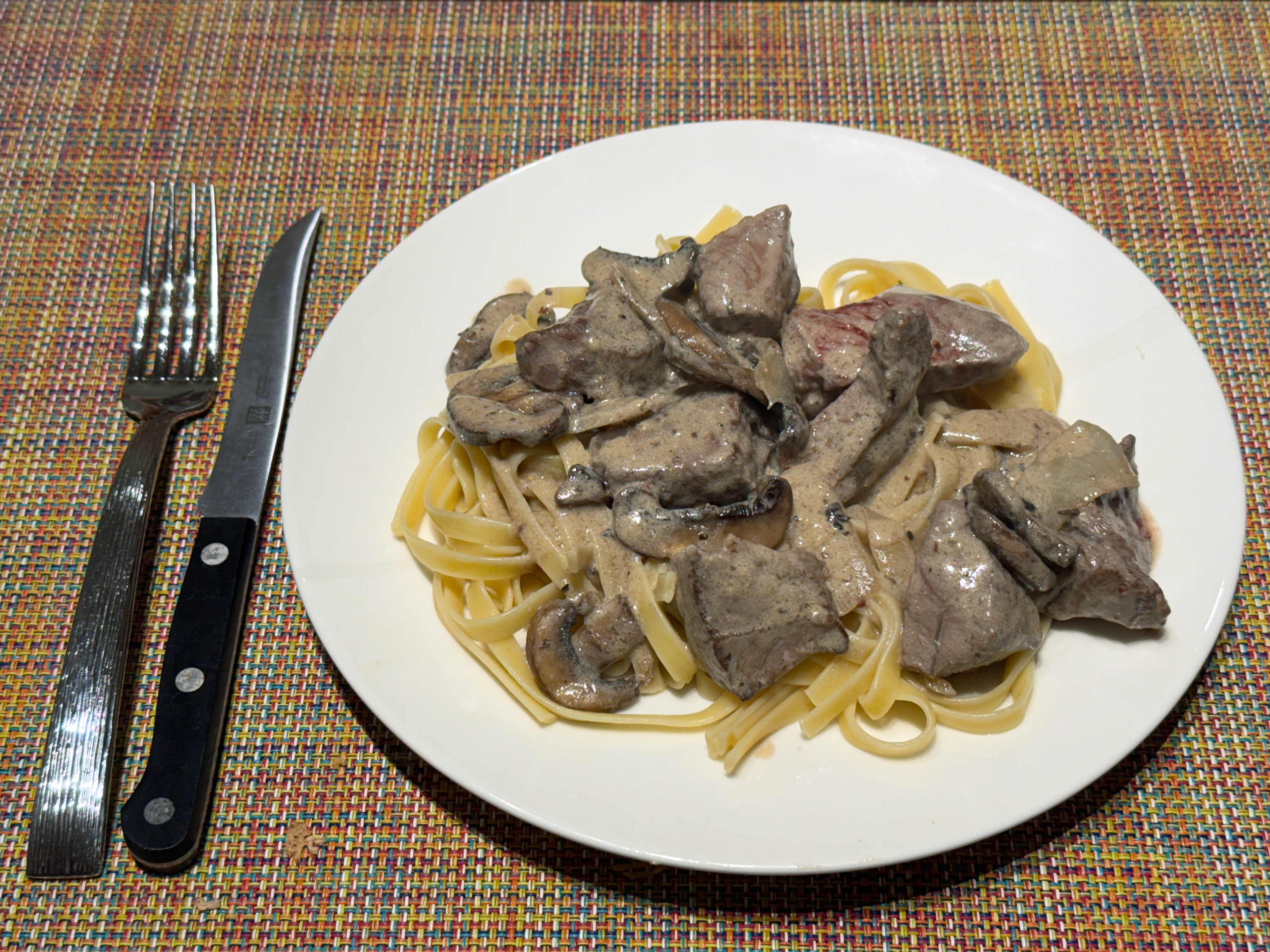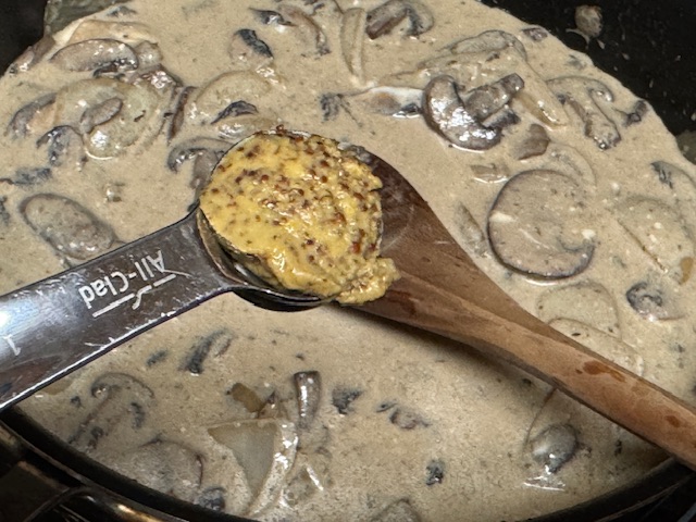 La version telle que je vous la présente est typique de sa préparation américaine, et très proche de ce que j’aime chez Bloomingdale’s. Là, il n’y a pas d’oignon dans la recette, et je soupçonne que la moutarde là est Grey Poupon plutôt que mon Fallot. Aux États-Unis, ce plat se mange toujours sur des pâtes, typiquement soit des pappardelle soit des fettuccine : je suis Bloomingdale’s ici avec des fettuccine. Je mélange des idées du blog américain Natasha’s Kitchen et du blog australien RecipeTin Eats, mais enfin, c’est aussi un peu mon jugement sur ce qui reproduit le mieux la recette telle que je l’aime chez Bloomingdale’s.