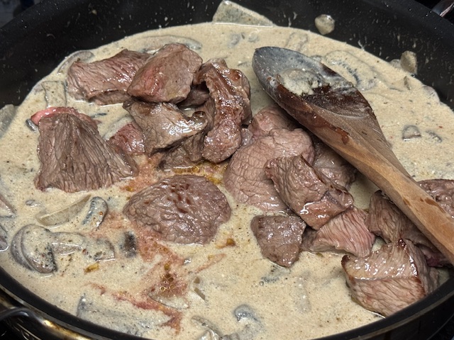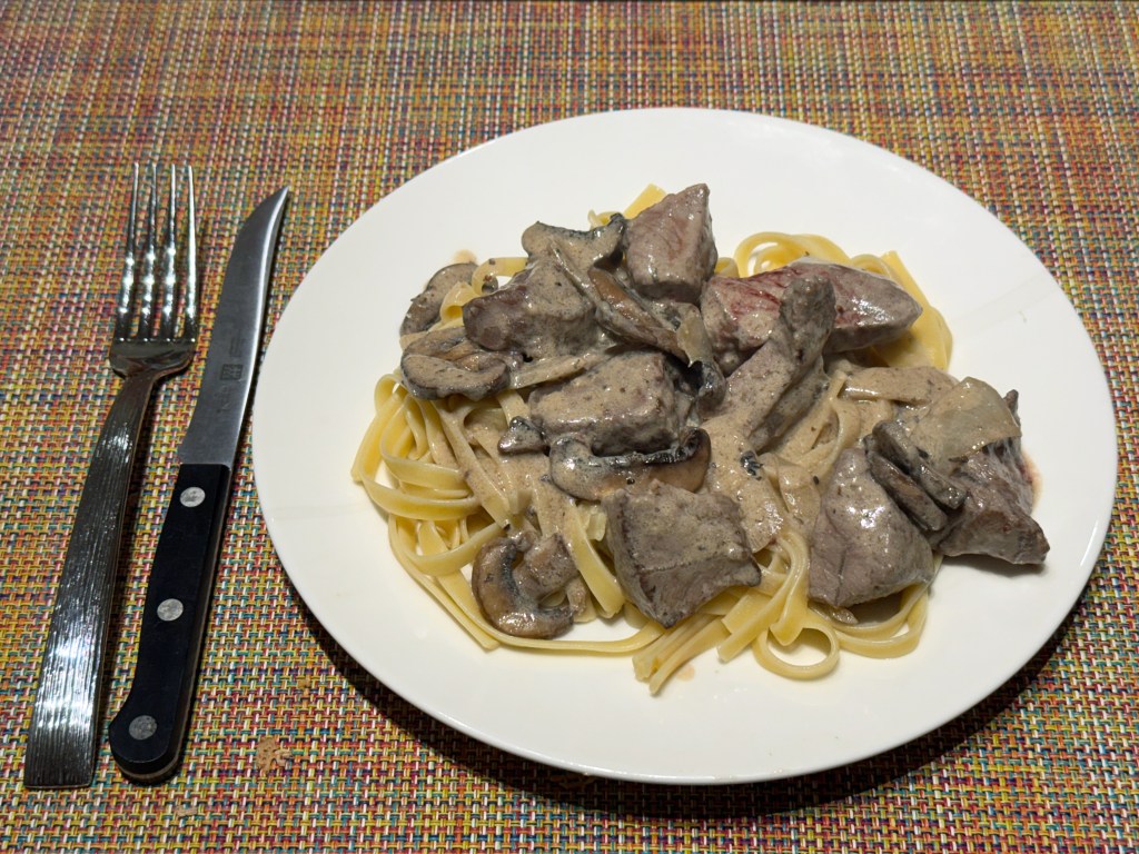 Il y a un resto que La Fille et moi aimons comme nulle part ailleurs, 59th & Lex. Le nom est l’adresse de l’original Bloomingdale’s à New York City (c’est une chaîne de grands magasins). Presque tous les Bloomingdale’s ont un resto de ce nom là-dedans, et si c’est juste un peu mieux que la moyenne, c’est aussi quelque chose que nous faisions ensemble toutes les semaines de sa naissance jusqu’au covid. Ils ont plusieurs plats que j’aime bien, mais de nos jours, mon préféré est le bœuf Stroganoff. Voici ma version :