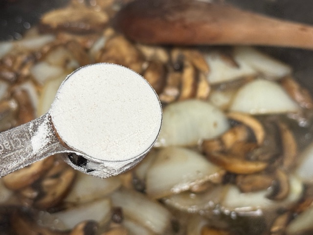 - Ajouter la farine à la poêle et faire cuire 1 minute de plus en remuant.