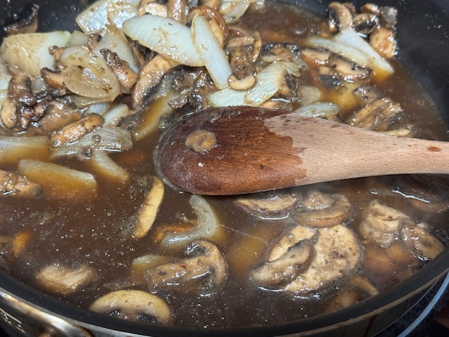 - Verser le bouillon de bœuf dans la poêle , puis ajouter la crème fraîche. Continue de faire cuire jusqu’à ce que la sauce devienne un peu plus épaisse.