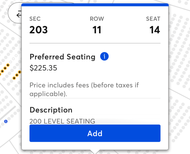 Cette place n’est pas proposée par un revendeur ; c’est Ticketmaster lui-même. Ça coûte 50 % de plus que ma limite ; pourtant, ça se trouve dans ce que l’on appelle les « nosebleed seats » — c’est-à-dire les places assez hautes pour faire saigner le nez. Ceci était presque le plus loin du plateau possible. Il n’y avait plus de places à 98 $ disponibles, mais franchement, j’ai horriblement du mal à imaginer où se trouvent ces places, ou si elles existent tout court.