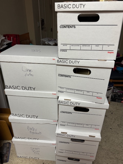 Il s’agit de toutes mes assiettes, les verres de vin jamais utilisés, et tous les ingrédients du placard. Ça ne comprend pas les deux robots, qui seront emballés dans leurs cartons originaux, ni certaines plaques de cuisson qui sont trop grandes pour ma taille de boîte. Oui, nous avons standardisé une taille unique pour tout, afin de garantir qu’il sera facile de tout ranger dans la voiture. J’adore Tetris ; je n’ai pas envie d’y jouer quand j’essaie de travailler rapidement. (Un de ces quatre, il nous faudra parler de Jonas Neubauer, après qui le Championnat mondial du jeu est nommé.)