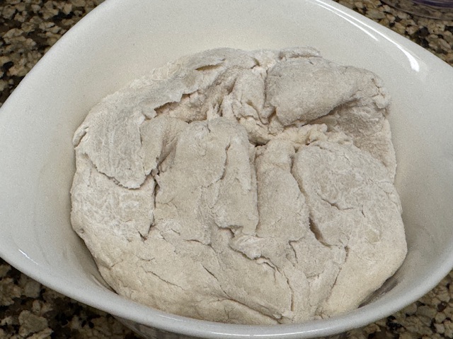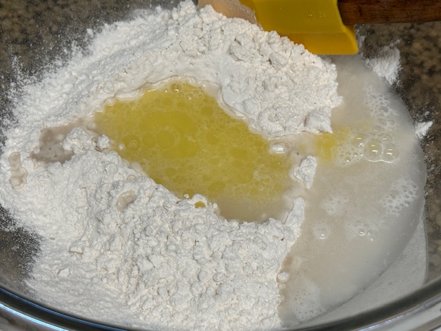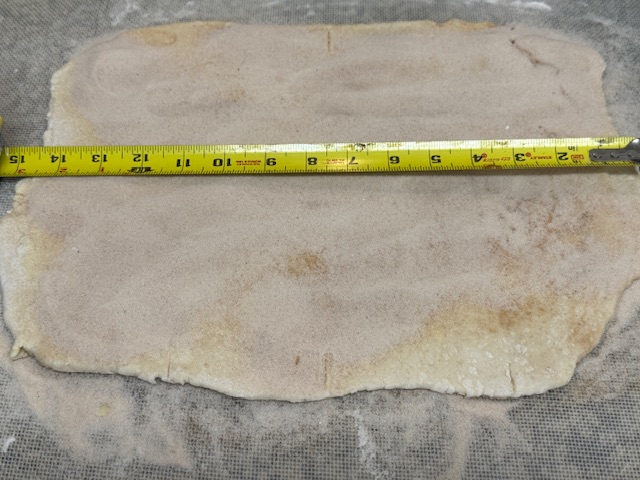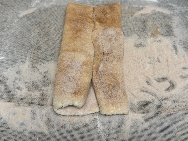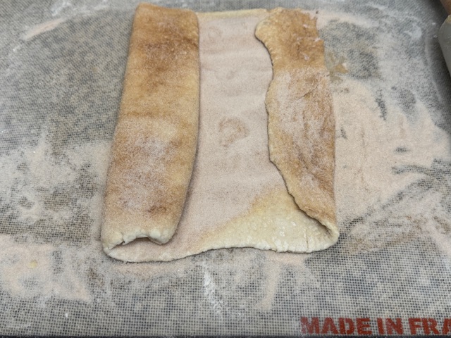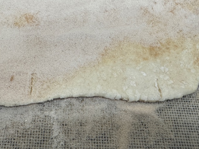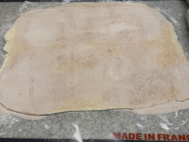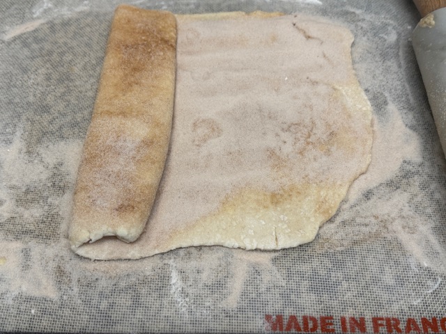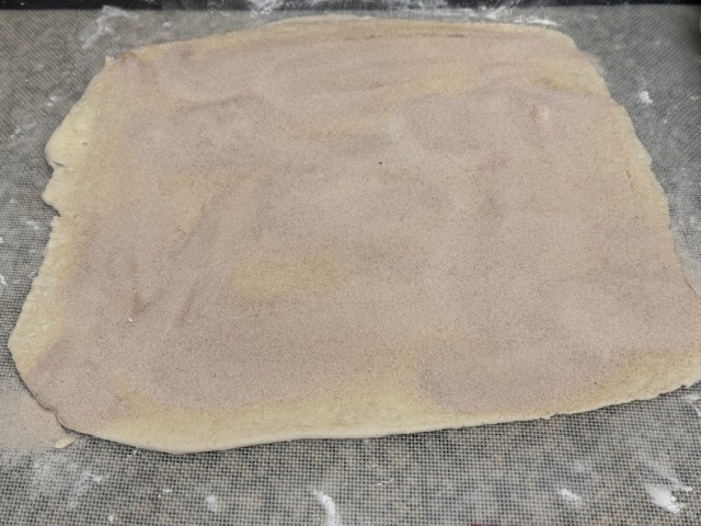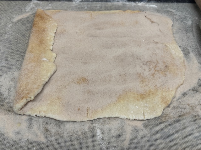1. Tourner la pâte. Saupoudrer avec un peu moins de l’autre moitié du sucre. On veut qu’il nous reste un cuillère à soupe de sucre/cannelle.