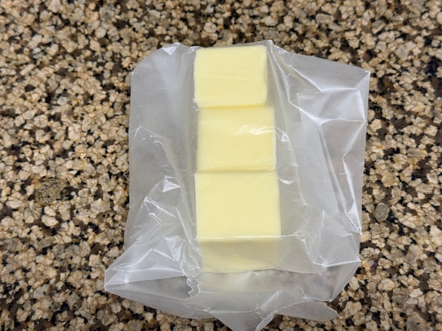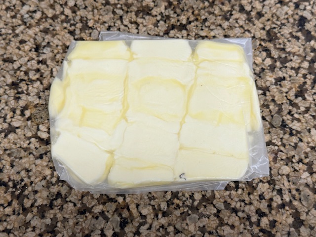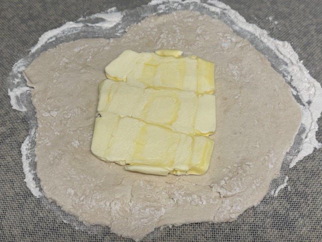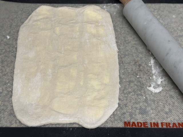 Pour notre recette, adaptée du blog Isabel Eats, nous allons préparer notre propre pâte feuilletée car il n’y a pas de Carrefour ici car on n’accepte jamais moins. (Désolé si le code Braille ne rend pas clair qu’une partie de la phrase a été barrée.) Si on a besoin de la recette complète de pâte feuilletée, c’est ici ; dans cette recette, je note juste les quantités.