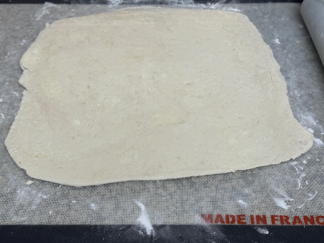 1. Étaler la pâte en forme de rectangle, d’environ 33 cm x 43 cm.