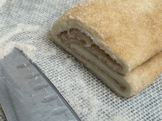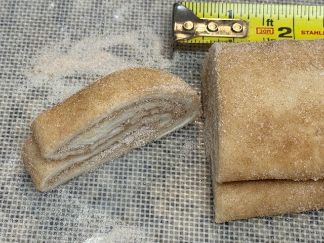 1. Vous aurez une bûche de pâte feuilletée. Couper net les bords. Puis couper des orejas d’une épaisseur de 1,25 cm (j’ai utilisé une règle).