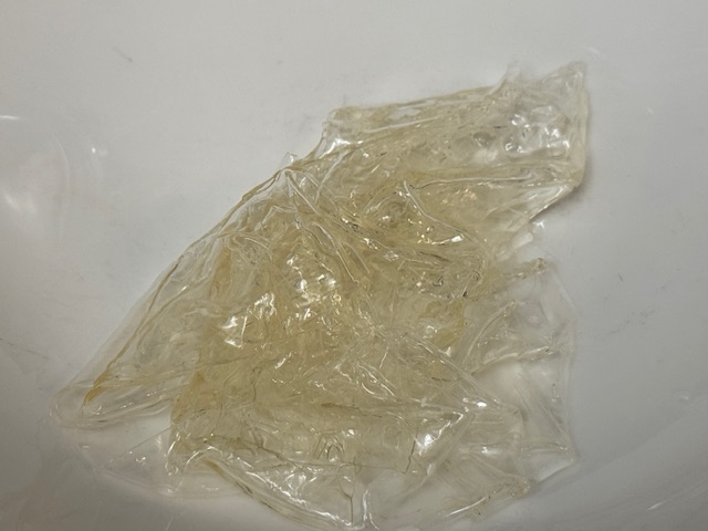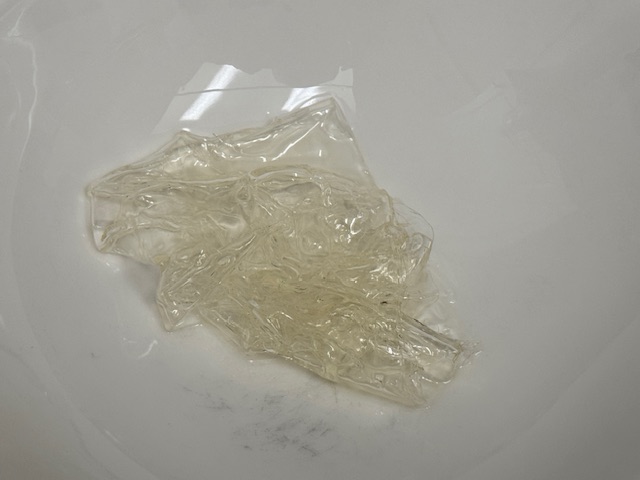 - Tamiser le coulis. Ça a rendu 80 mL de liquide. J’y ai rajouté 20 grammes de solides du tamis pour avoir des graines, mais pas trop. Égoutter la gélatine et la déposer dans le coulis chaud. Laisser refroidir à température ambiante.