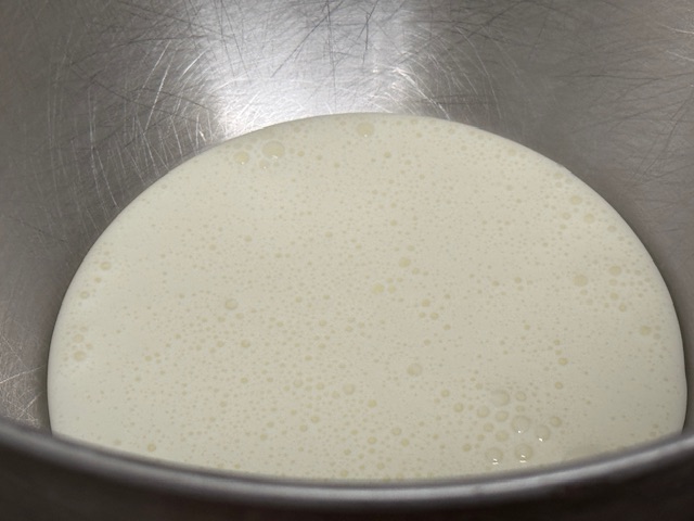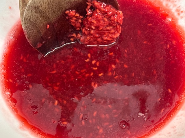 - Tamiser le coulis. Ça a rendu 80 mL de liquide. J’y ai rajouté 20 grammes de solides du tamis pour avoir des graines, mais pas trop. Laisser refroidir à température ambiante. (Oui, c’est exactement pareil à l’autre mousse jusqu’ici.)
