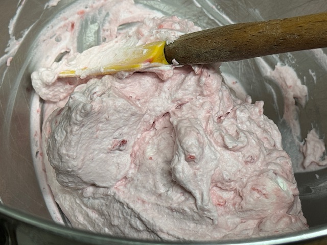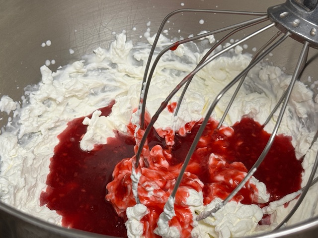 - Ajouter le coulis de framboises et continuer à plier la mousse. Laisser reposer quelques minutes au congélateur avant de faire le premier montage.