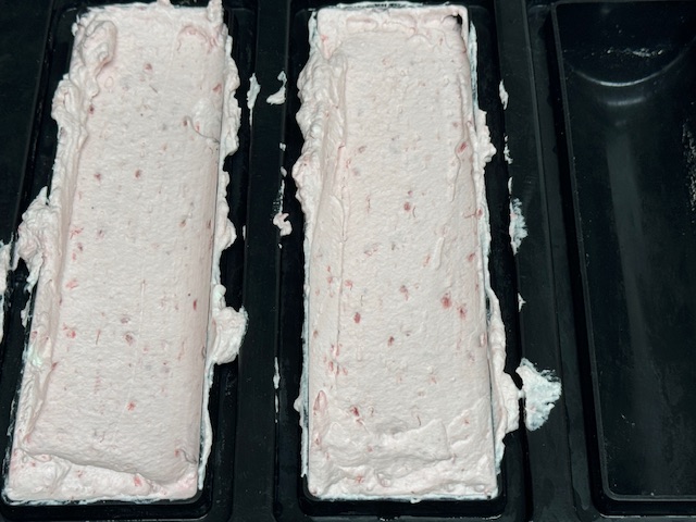 - Verser le coulis dans la crème fouettée et mélanger bien avec une maryse. Remplir deux puits d’un moule à mini-bûches, et laisser reposer une nuit au congélateur.