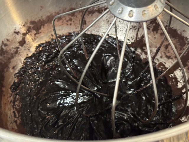 Le gâteau chez Extraordinary Desserts utilise un gâteau au chocolat selon la façon américaine. Je l’aime, mais je croyais que ce serait difficile à adapter comme la base d’une bûche. Trop fragile si on le coupe. J’ai donc adapté une recette de brownies de la société King Arthur, le meilleur producteur de farine du pays. Même avant de monter la bûche j’ai coupé des morceaux pour tailler les brownies, goûté des restes, et me suis dit « C’est une tuerie ! » Je voulais avoir un insert de mousse à la framboise ; j’ai adapté une recette de Larousse Gastronomie — c’est sans sucre pour plus d’acidité et une saveur plus intense. Mais la vedette de cette recette, c’est la mousse chocolat-framboise qui relie ces deux autres choses. C’est adapté de mes bûches d’avant, mais avec un coulis de framboises et juste assez de graines pour rappeler vraiment des framboises fraîches. Et puisque c’est d’après une truffe, le tout est recouvert de chocolat.