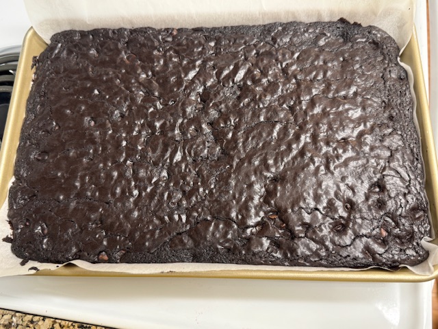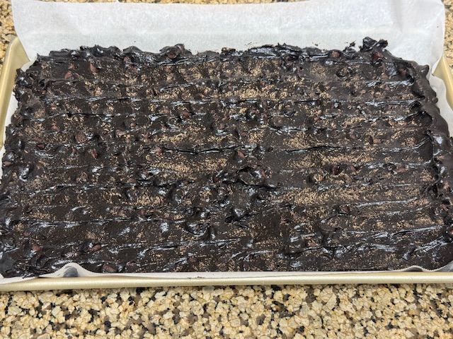 - Une fois sortie du four, retirer le papier de cuisson de la plaque et laisser refroidir sur le comptoir. On veut que les brownies soient complètement refroidis avant de les couper.