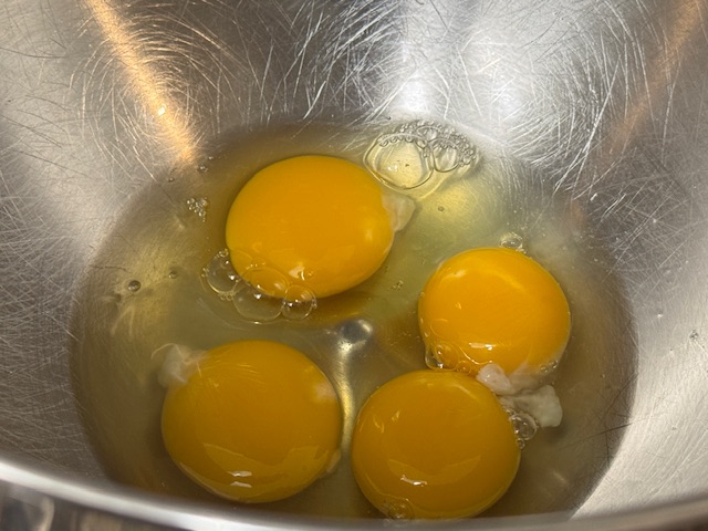 - Dans le bol d’un robot, fouetter les œufs et les jaunes ensemble.