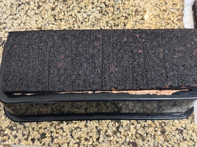 - Poser la moitié du brownie au-dessus du moule. Tailler selon les bords du moule, puis appuyer sur le brownie pour sceller la bûche.