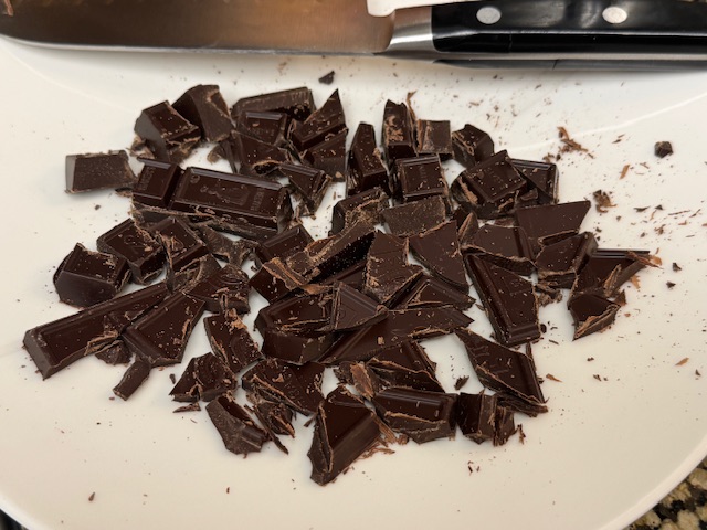 - Pendant que le chocolat fond, hacher l’autre 1/3 du chocolat.