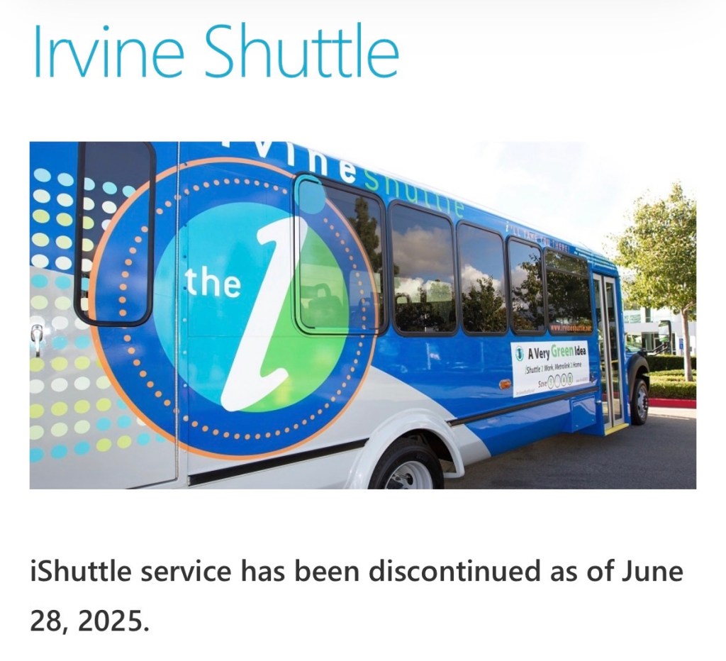 J’avais supprimé une astuce sur les bus locaux. Au passé, je vous ai dit que je n’ai jamais pris un bus à Irvine, et ça reste le cas. Mais anciennement, dans mon vieil appartement, tout près de Jamboree, il y avait un arrêt très, très près de chez moi pour ce qui s’appelait « iShuttle » (pour Irvine Shuttle). Je n’ai pas vu ce bus depuis des mois. Alors quand j’ai cliqué le lien du Guide Pratique pour le vérifier, j’ai vu cette notification, et j’ai décidé de le supprimer :