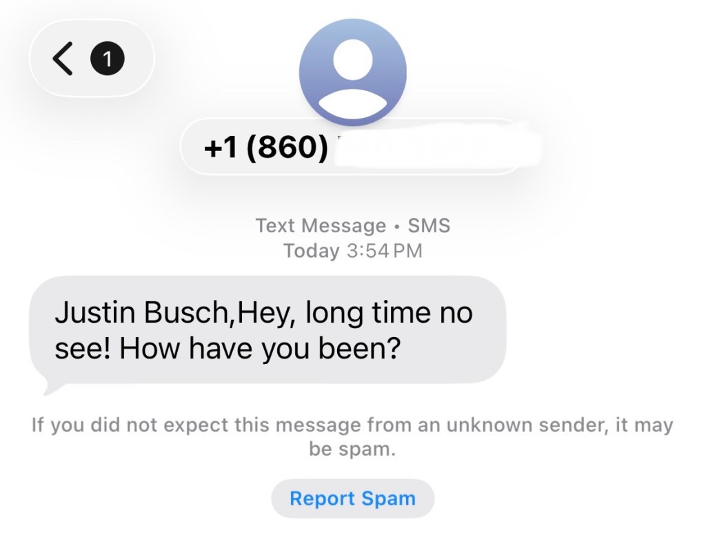 Ça dit « Justin Busch, hé, ça fait belle lurette ! Comment vas-tu ? » Je ne connais pas le numéro, et je ne connais personne dans le Connecticut (l’endroit lié au code 860). Mais les arnaqueurs deviennent évidemment plus sophistiqués, avec des données personnelles.
