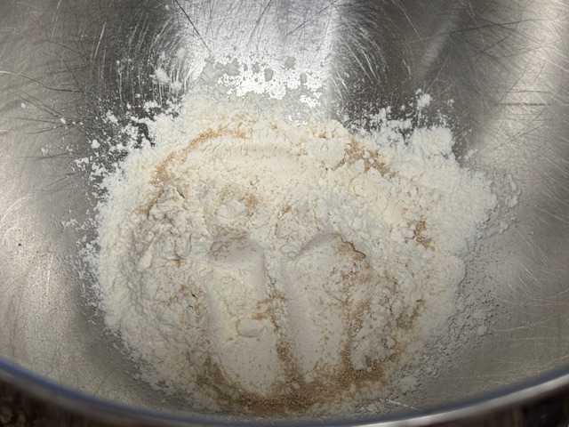 - Dans le bol d’un robot pâtissier, mélanger la farine et la levure boulangère sèche.