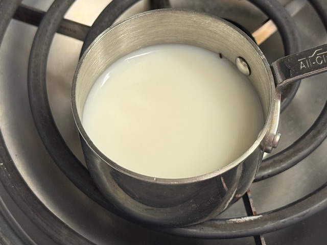 - Verser le lait et l’eau dans une tasse et les faire chauffer jusqu’à ce que le liquide soit tiède, soit sur la cuisinière soit au micro-ondes.