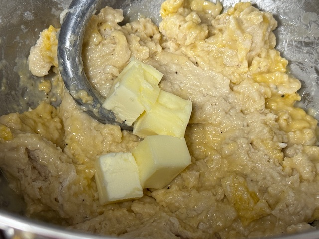 - Ajouter le beurre et plier la pâte autour du beurre. Pétrir jusqu’à ce qu’il disparaisse.