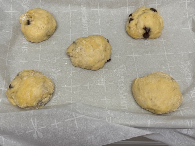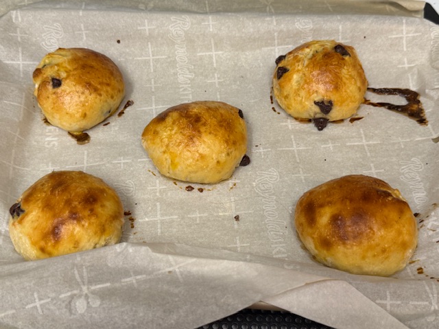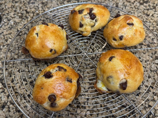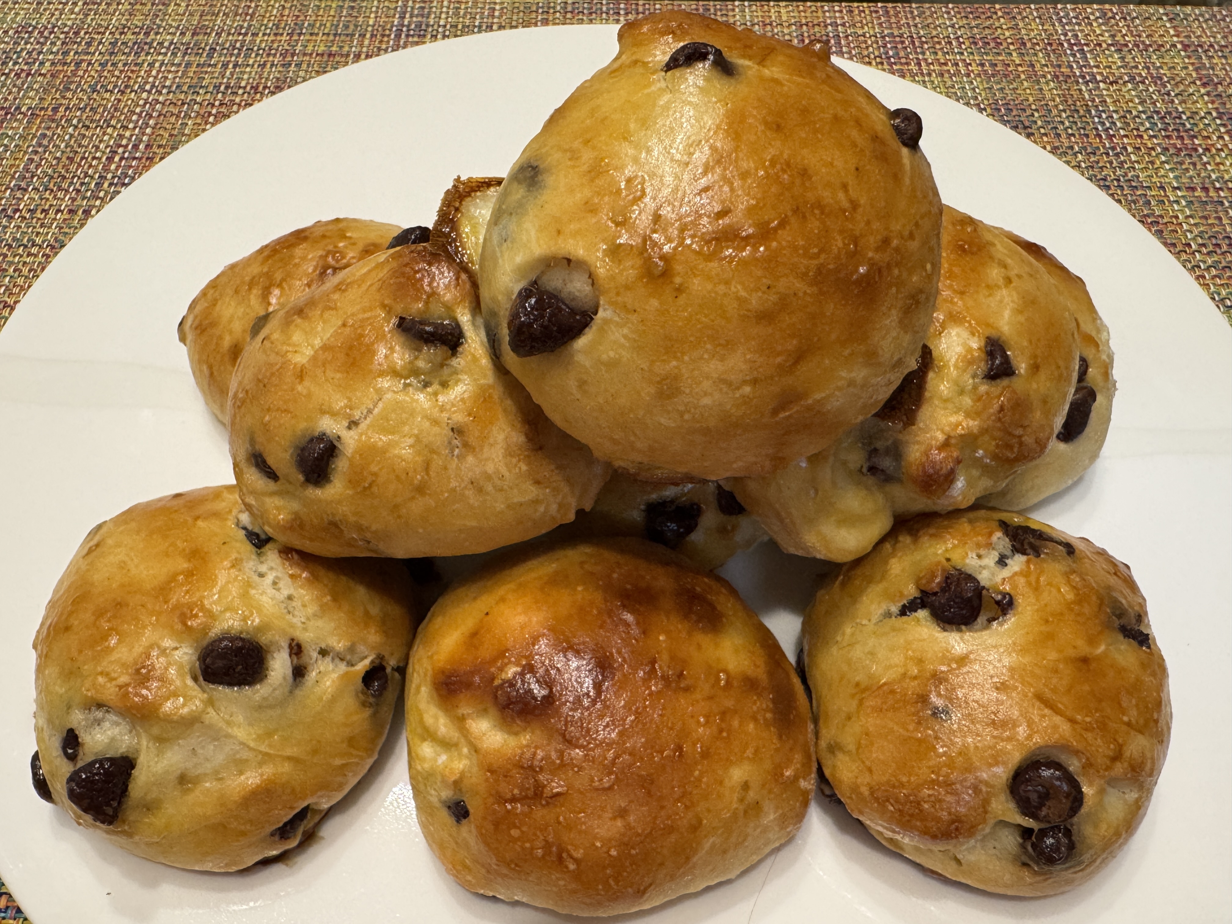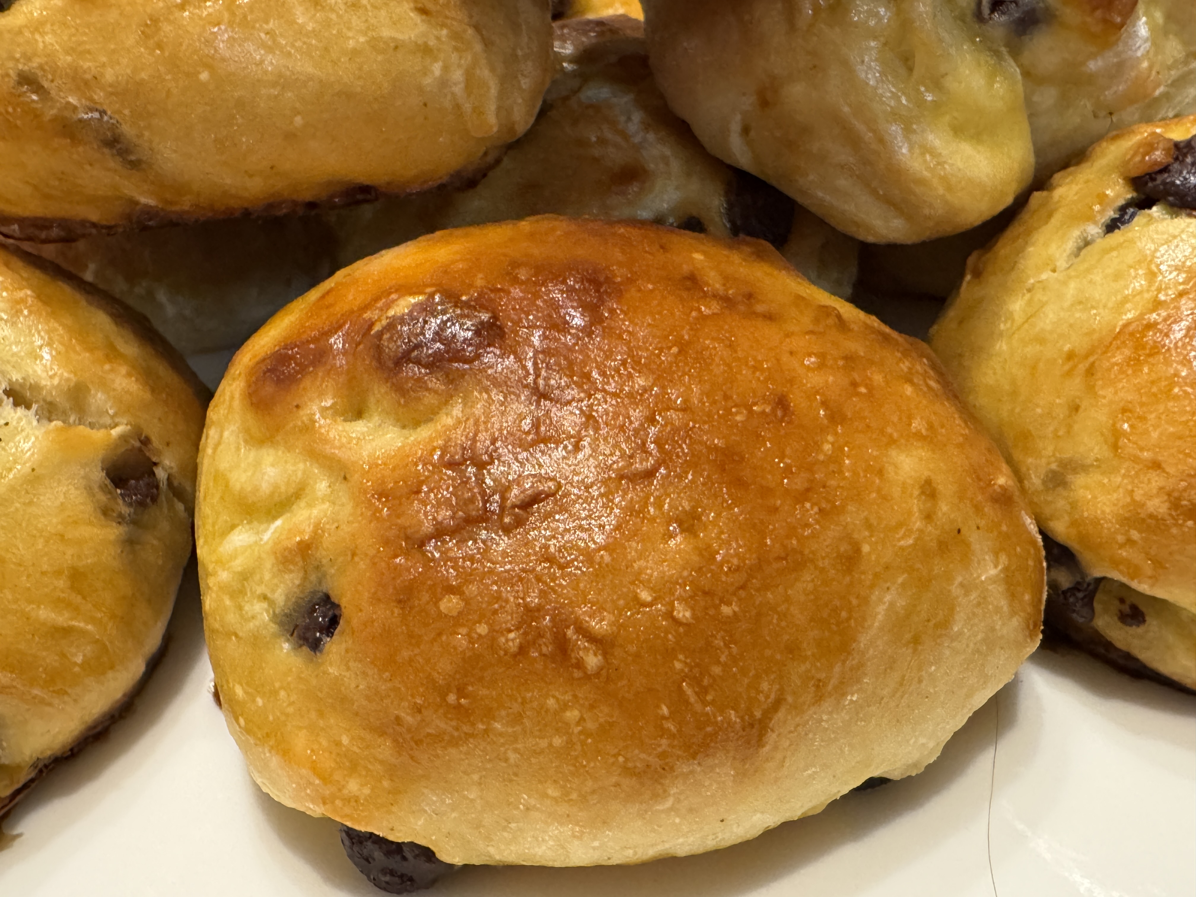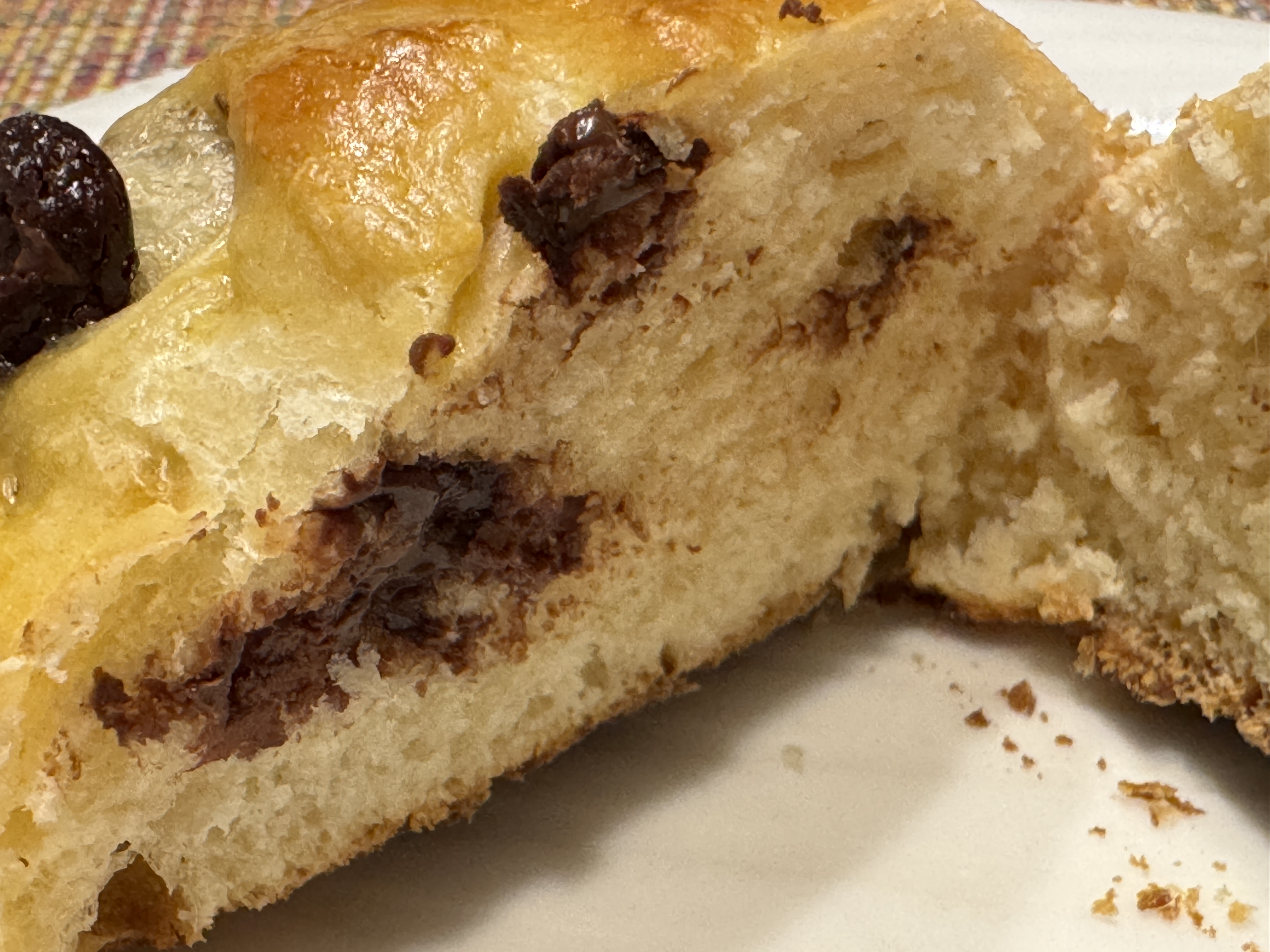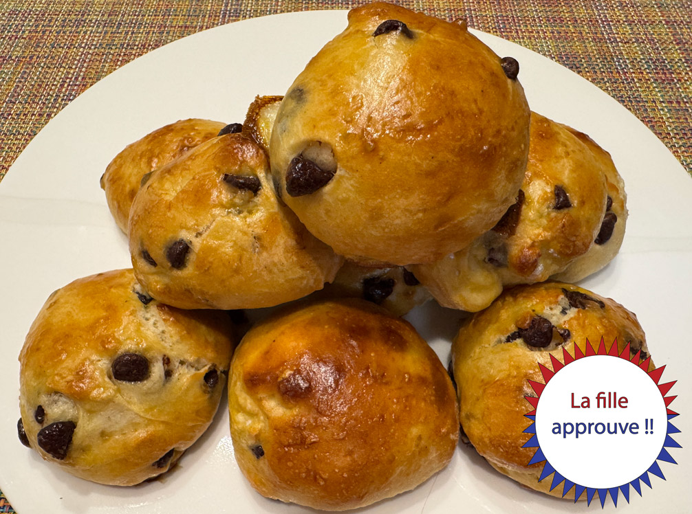Ce sont un genre de petit pain plutôt comme la brioche, mais avec une plus petite quantité de beurre par rapport aux brioches typiques. Ça donne une texture plus ferme, mais on ne s’en plaint pas avec des pépites de chocolat pour fondre dans la bouche.