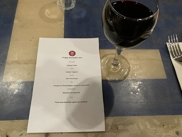 Voilà la carte — puisque le dîner a été pour un grand groupe, il n’y avait pas trop de choix. Mais ils ont aussi un plus grand menu. Quant au vin, je sais seulement que c’était un Côtes-du-Rhône, et c’était 8 $ le verre. Un peu cher pour un vin inconnu, mais habituel ici.