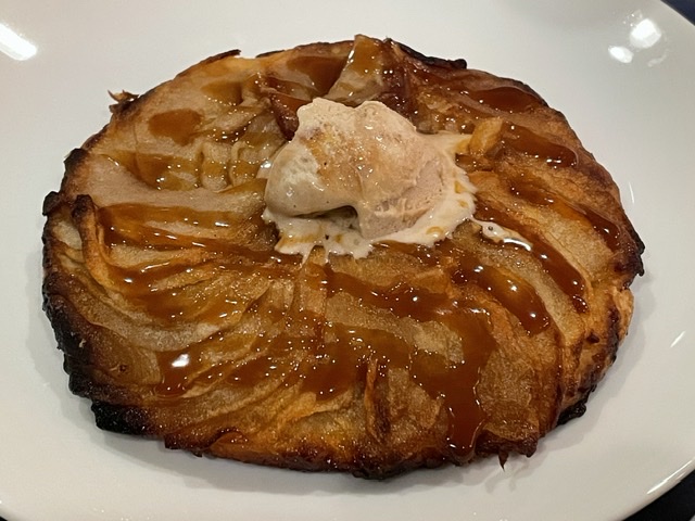 J’ai commandé la salade frisée, le poulet au champagne, et la tarte aux pommes. J’ai complètement oublié de prendre une photo de la salade. ([Ignorez le gros con. Il n’avouera jamais qu’on mange les mêmes trucs. — M. Descarottes.]) Tout était très bien. Pour 45 $, le prix fixe pour ce soir-là, c’est pas un bon marché, mais ça vaut l’argent.