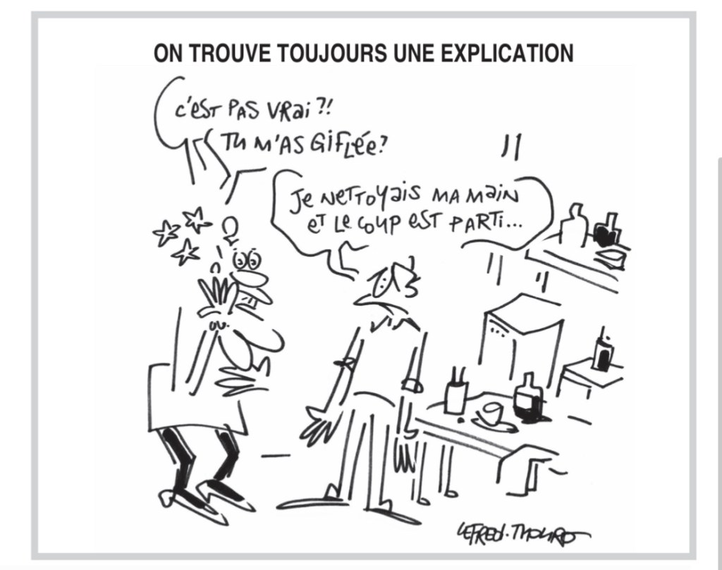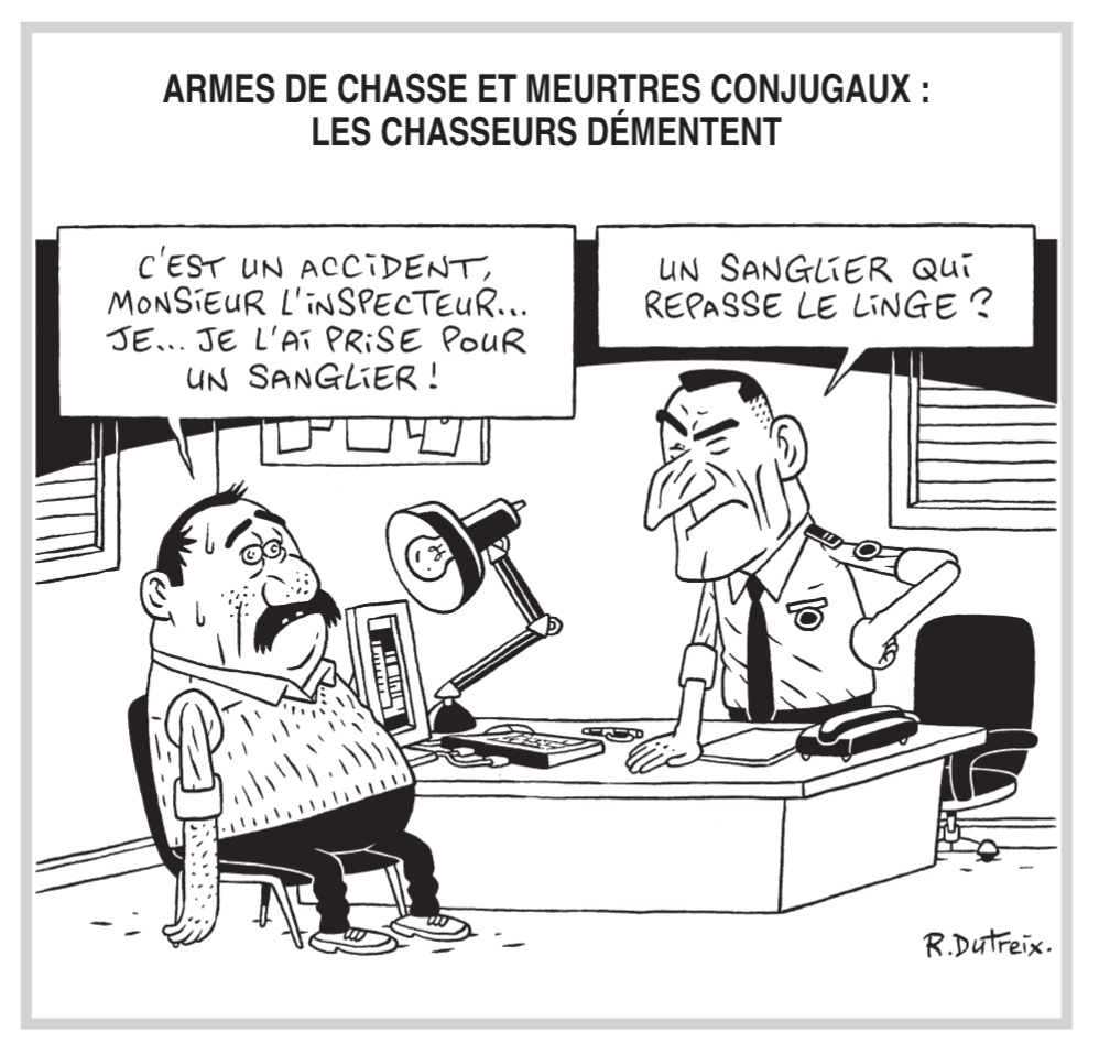 Quant à notre prochain dessin, il s’agit d’une plainte de la Fédération nationale des chasseurs contre Sandrine Rousseau, à propos de la question des armes de chasse et de leur utilisation dans des meurtres conjugaux. Alors, mon ex habite dans le village d’Anguille-sous-Roche, à côté de mon Elbe-en-Irvine. Il n’y a pas de sangliers là-bas, et malgré la réputation des États-Unis, je n’ai pas d’armes à feu. Je vous dis ça au cas où on porterait des accusations.