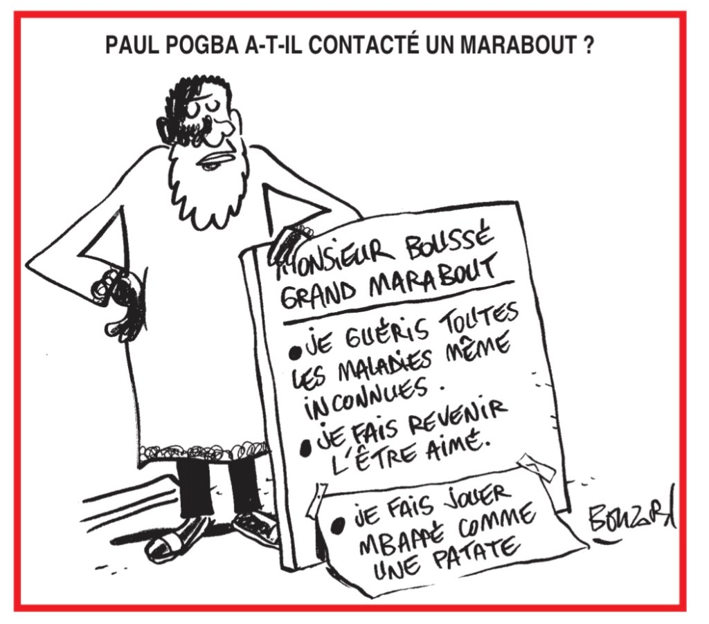 Notre troisième dessin est un cadeau pour mes huit abonnés dont leurs profils indiquent qu’ils sont voyants ou marabouts. Il s’avère qu’un footballeur, M. Paul Pogba, a peut-être consulté des marabouts pour lancer des sorts contre M. Kylian Mbappé. C’est quand même mieux que nos footballeurs, qui lancent plutôt des coups de feu. Moi, je ne sais rien de leur efficacité, mais ils ont clairement de bon goût, alors je les lui recommanderai s’il me demande des conseils.