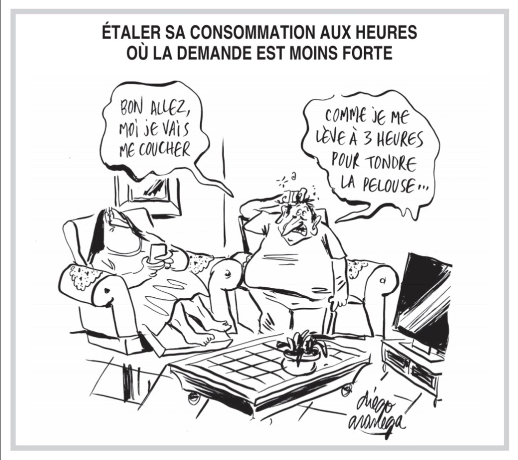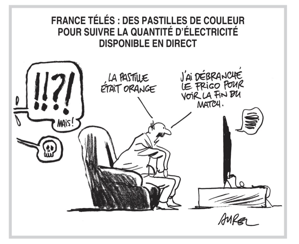 Ça dit qu’il y aura des coupures électriques à moins que nous ne pratiquions tous la sobriété énergétique jusqu’à 21h. Exactement comme notre premier dessin :