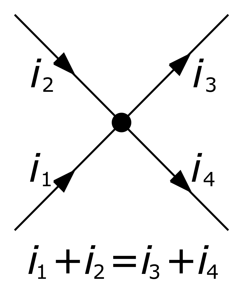 Thévenin connaissait deux autres lois aussi, celles de Kirchhoff. La loi de nœuds de Kirchhoff dit simplement que n’importe où que l’on trouve un nœud, comme ça :