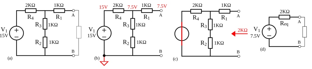 Thévenin a bien compris ces lois. Alors sa grande idée, c’était que l’on pouvait remplacer un circuit, quel que ce soit, par un seule et unique générateur de tension et une seule résistance. Je ne vais pas vous mener dans un exemple, car il y a plusieurs manières d’ajouter les résistances, et ce n’est pas un blog de maths. Mais par exemple, on peut remplacer tout un schéma de 4 résistances par une seule et unique résistance, comme ça :