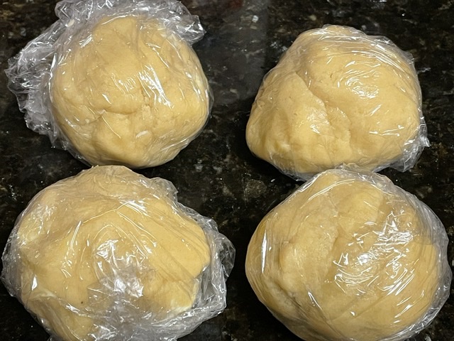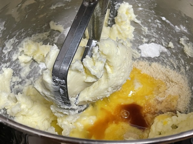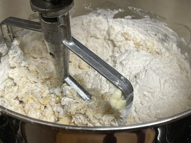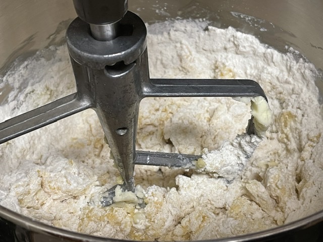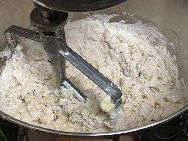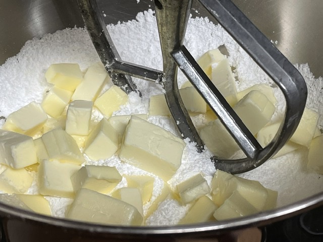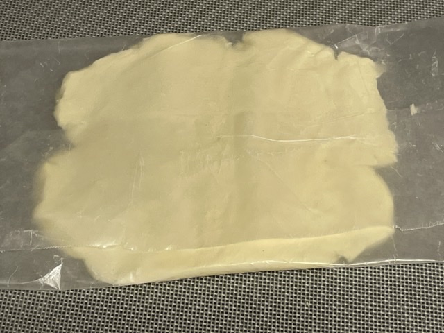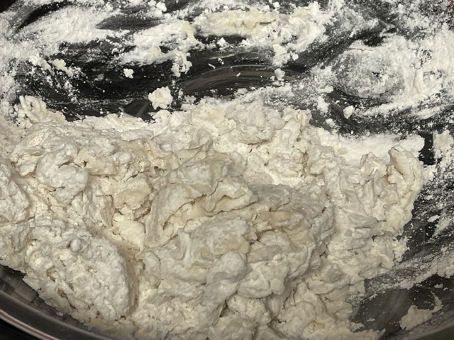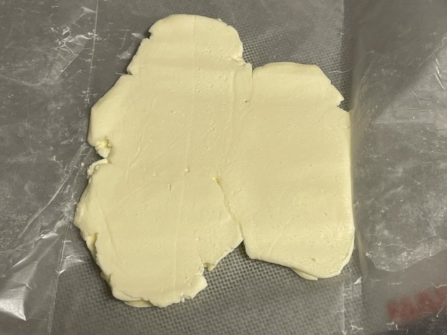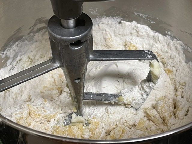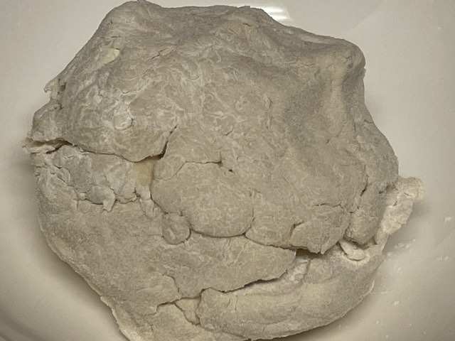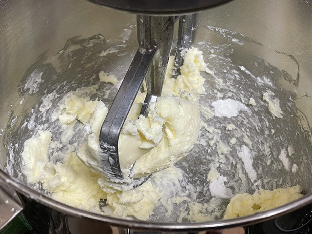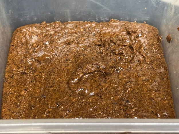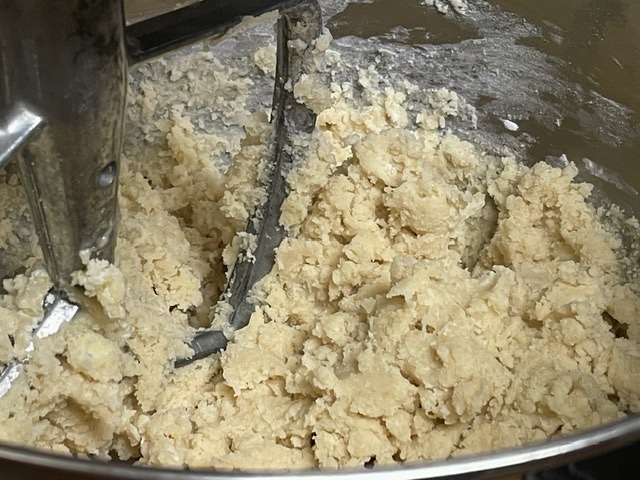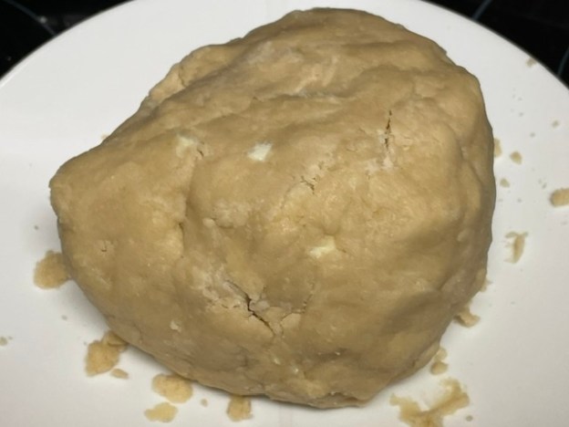 - Mixer les deux jusqu’à l’obtention d’une pâte, plutôt qu’une poudre. Je ne dirai pas une pâte lisse, parce que je trouve que celle-ci reste très épaisse bien après être devenue une pâte. Comme avant, j’ai dû arrêter plusieurs fois avant l’obtention du produit final.